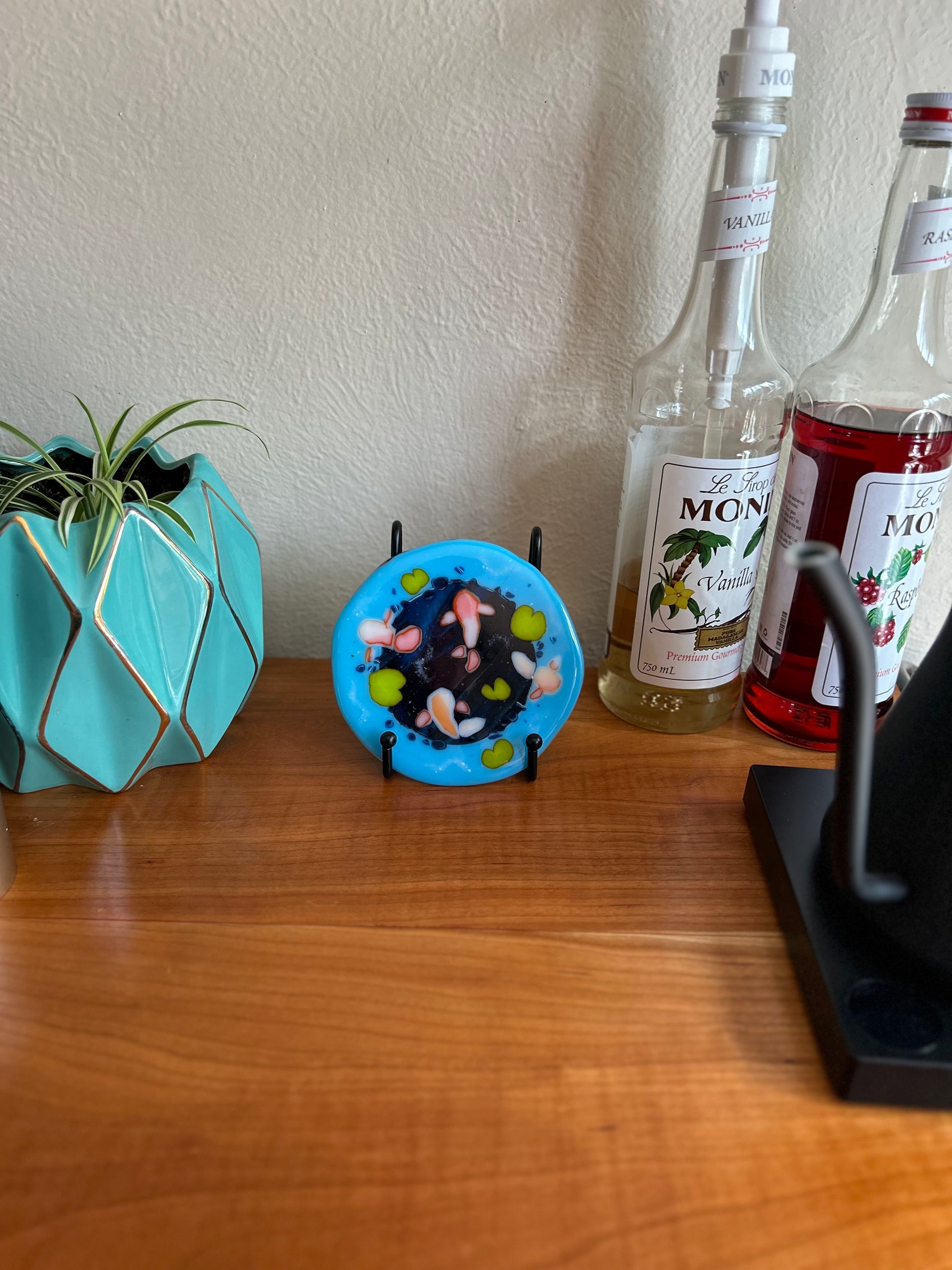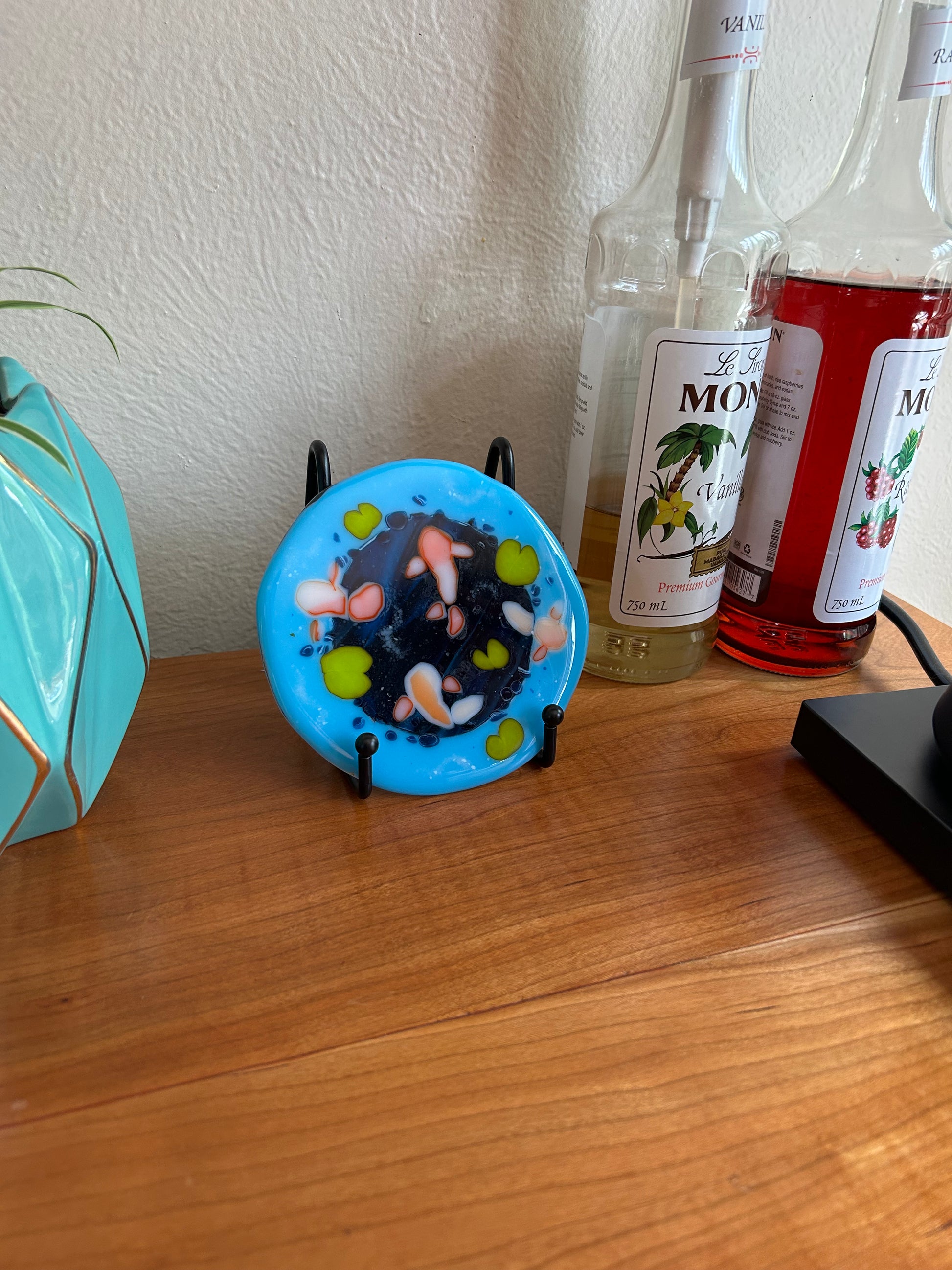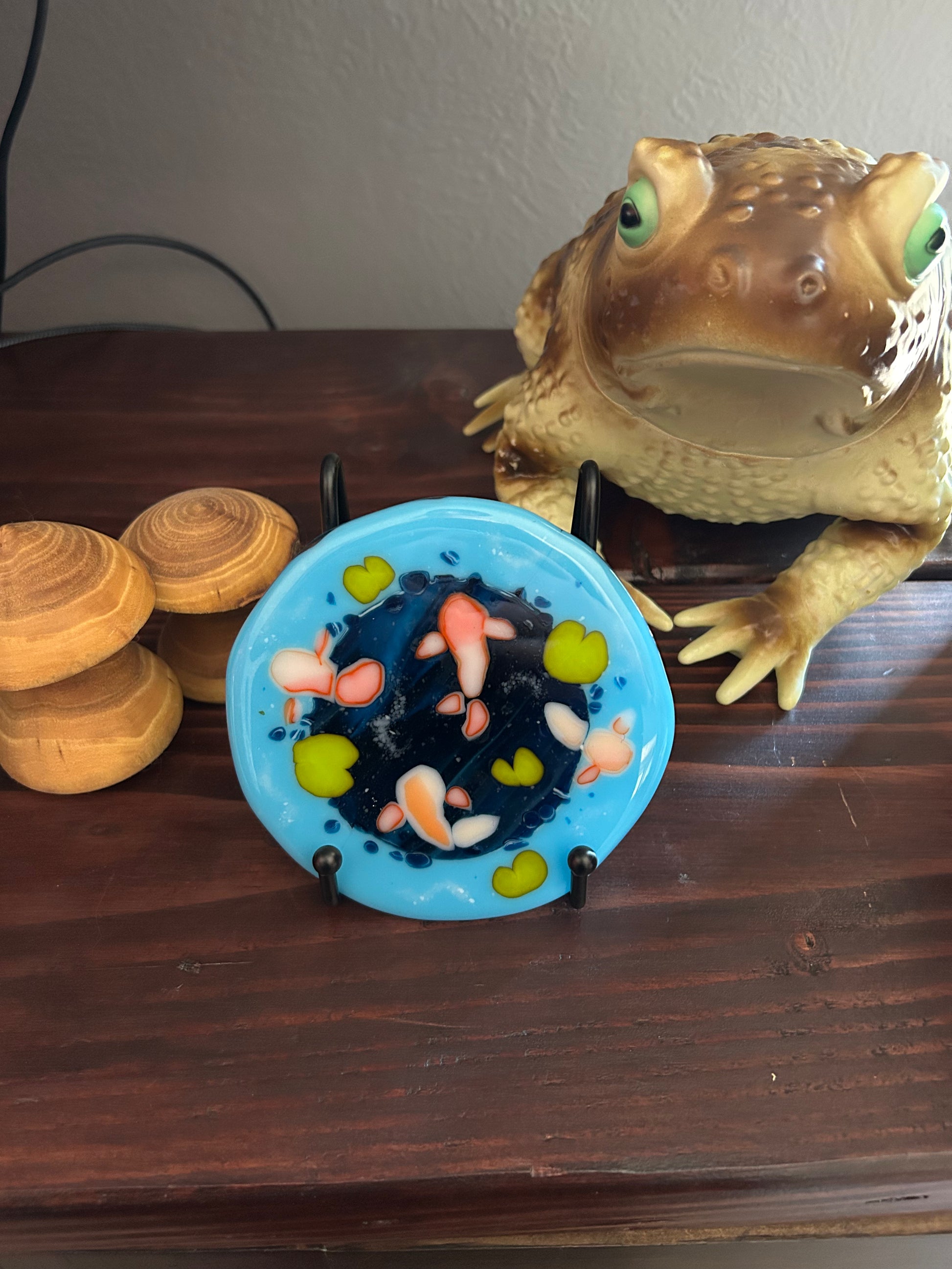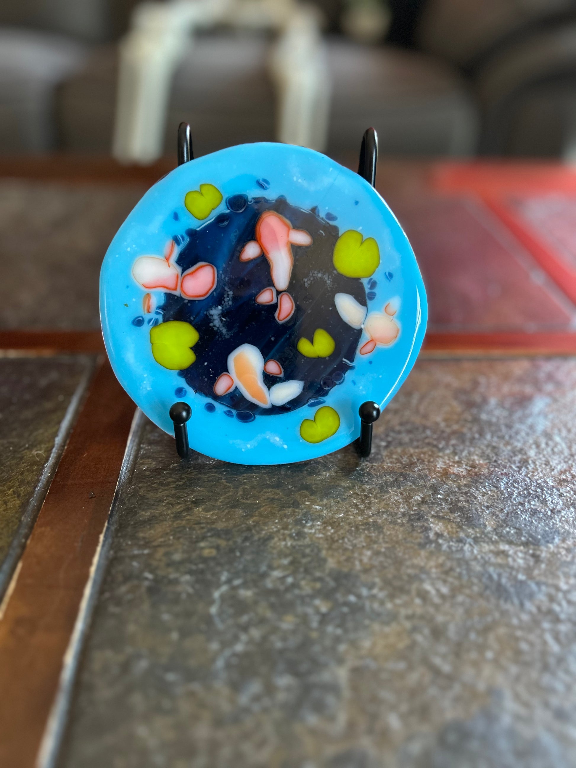 This fusing piece creates a window down into a stained glass koi pond, featuring four koi, lily pads, and water depth.