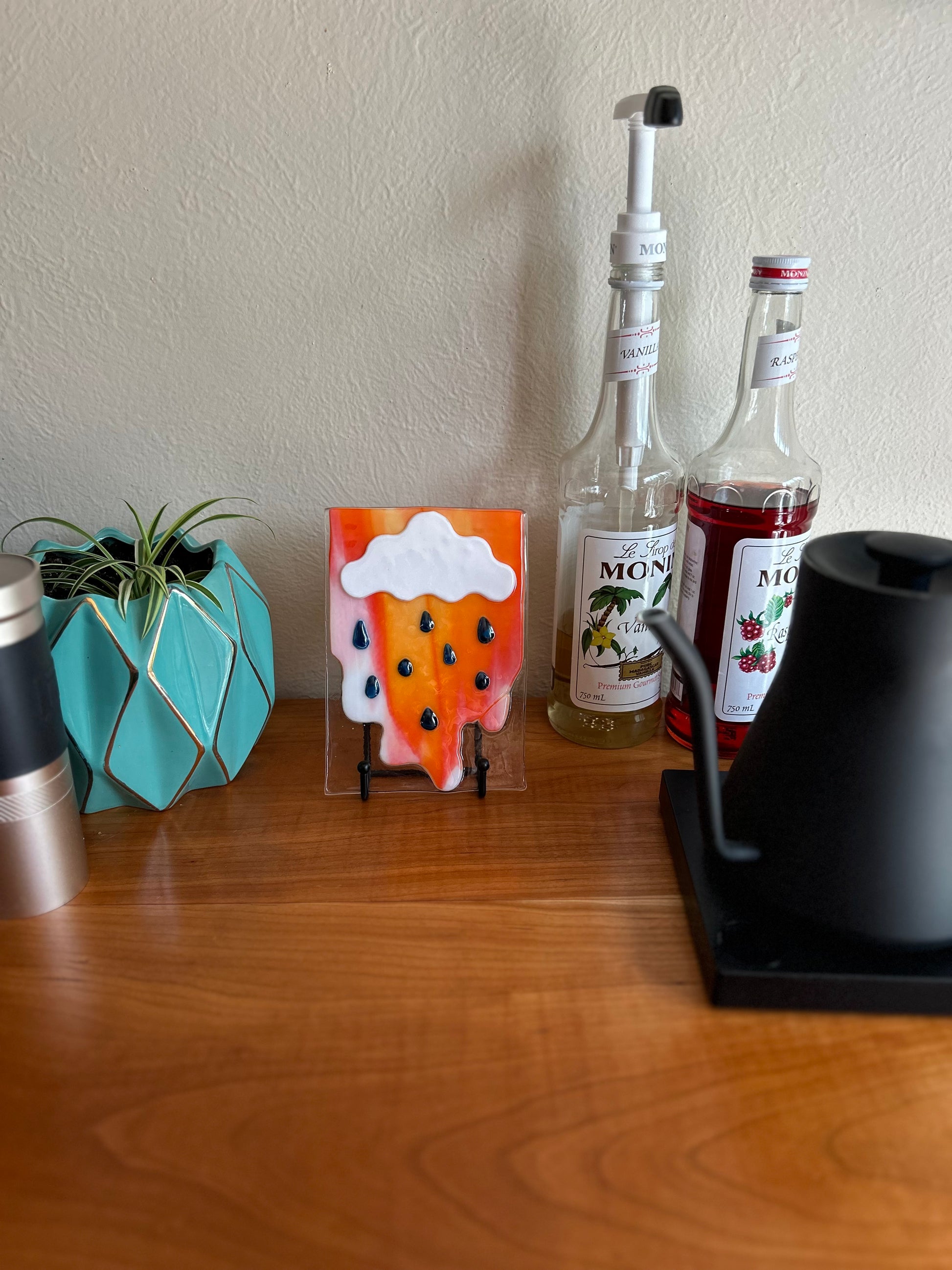 This piece is entirely made of Bullseye Glass, and shows a white cloud with large, dark blue rain drops against a melting golden hour sky.