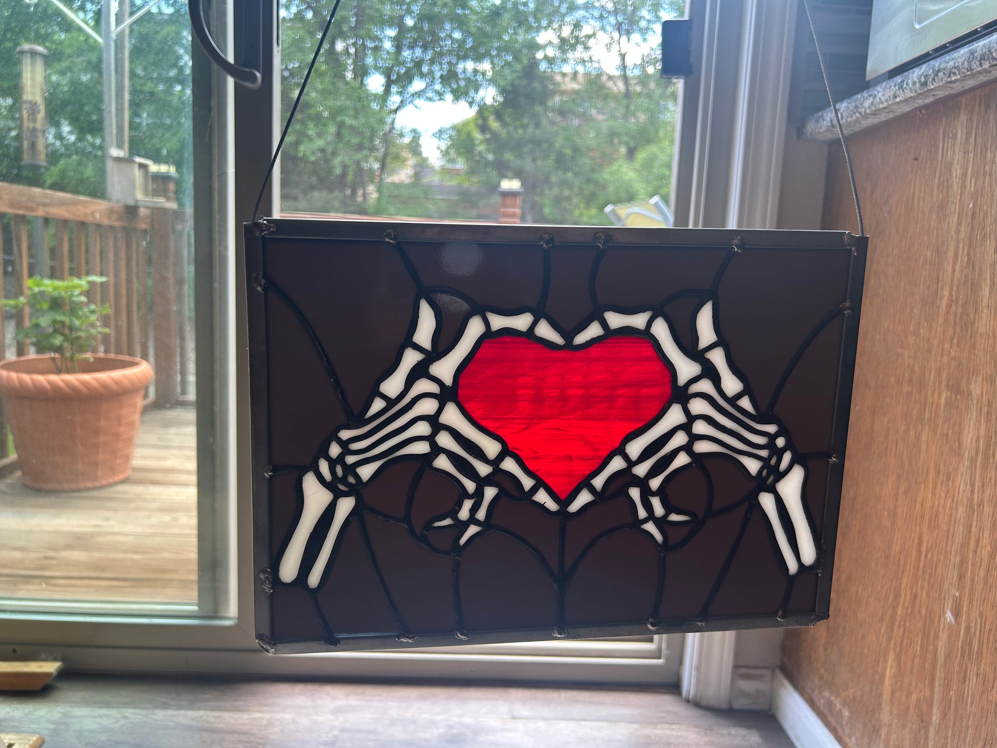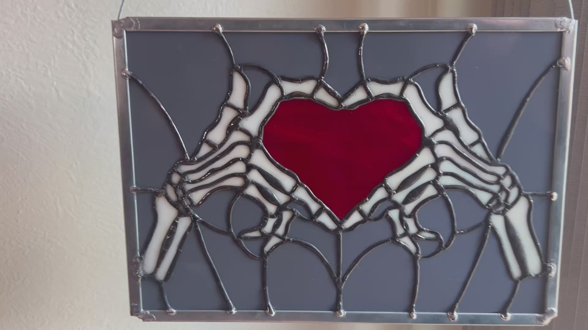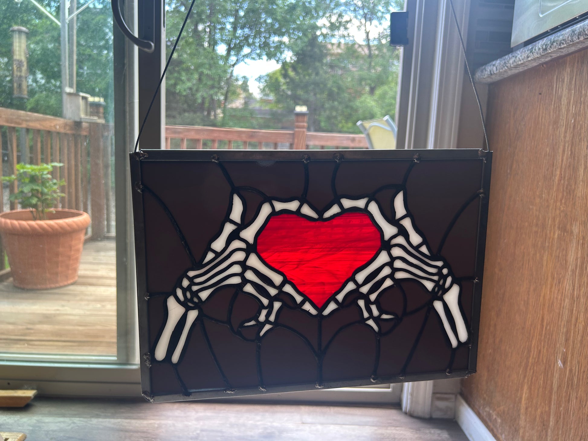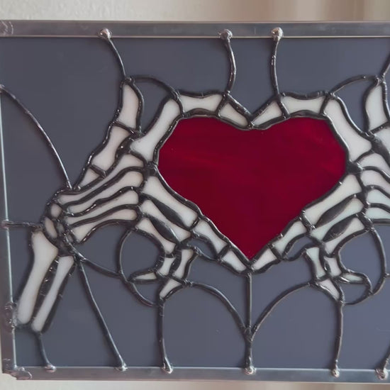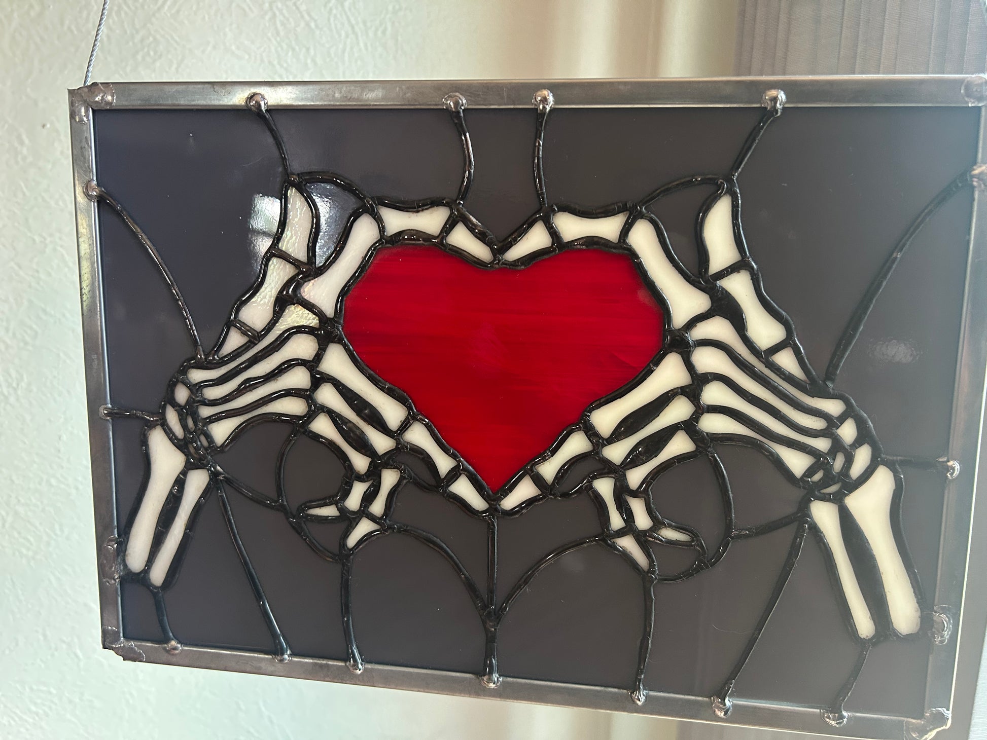 The surrounding glass is a light grey, the heart is red wispy glass, and the skeleton hands have a touch of iridescence to them.